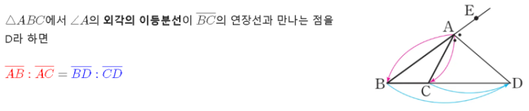 그림과 같이 한 꼭짓점 A의 외각을 이등분하는 직선이 있을 때 활용할 수 있습니다.